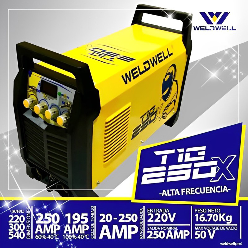 La máquina de soldar industrial ARC250X de Weldwell, con una capacidad de 250 amperios, es una opción robusta para soldar en la posición 6G. Compuesta por tres tarjetas para mayor durabilidad y facilidad de reparación, pesa 10.30 kg y opera con corriente monofásica de 220 V. Incluye accesorios como cable porta electrodo, cable con grapa tierra, máscara fotosensible y guantes. La función opcional de LIFT TIG (antorcha adicional) amplía su versatilidad.